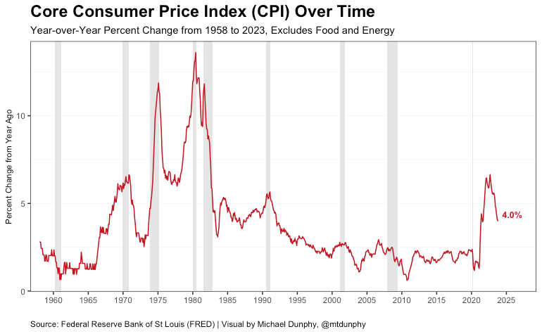 Below you can see how Core CPI has changed in the United States from 1958 to 2023 with data provided by the Federal Reserve Bank of St Louis (FRED). Grey shading indicates a recession classified by the National Bureau of Economic Research (NBER).