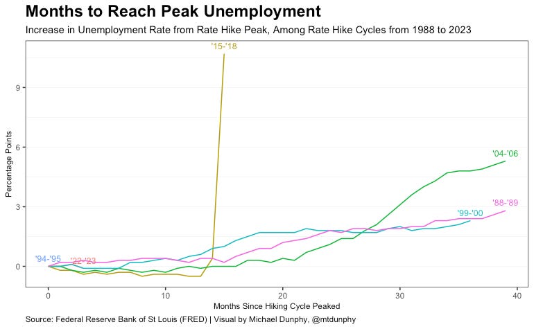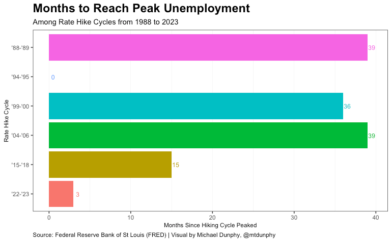 This leaves one remaining rate hike, 1994 to 1995, which was characterized as a “soft landing” at the time as it did not result in increased unemployment or a recession. I may look closer at this period to better understand why this turned out to be the case in a future post.