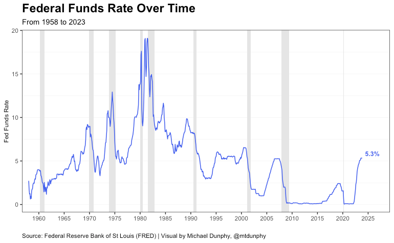 Below you can see the federal funds rate over time from 1958 to 2023. The fed funds rate was at its highest in the early 1980s due to Fed Chairman Paul Volcker’s actions to bring inflation down seen in the previous chart. Today, the federal funds rate is 5.3%, a sharp increase from the close to 0% rate during and following the pandemic.