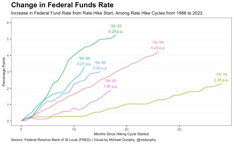 The graph below shows the change in federal funds rate for each of the rate hike cycles from 1988 to 2023. As you can see, the most recent actions by the Fed have resulted in the largest and quickest rate hike in the last 35 years.
