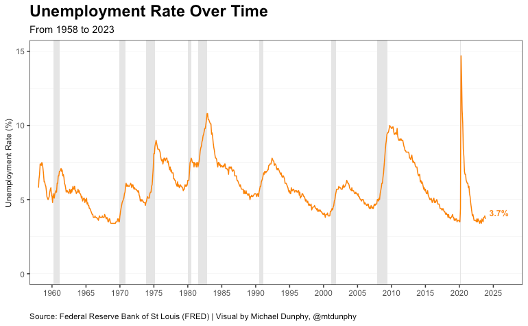 Below is the unemployment rate from 1958 to 2023. You can see unemployment rises sharply in the 80s following the Fed’s actions of hiking rates to nearly 20% in 1981. Today, unemployment is historically low at 3.7%, a swift recovery from the nearly 15% unemployment rate in April 2020.