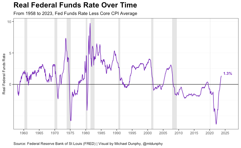 As inflation spiked following the supply shock created by the pandemic, the Fed began to increase rates to combat rising prices and cool an overheating economy. Since June of this year, the real rate has surpassed 0%, now reaching 1.3% last month, the highest since 2008.