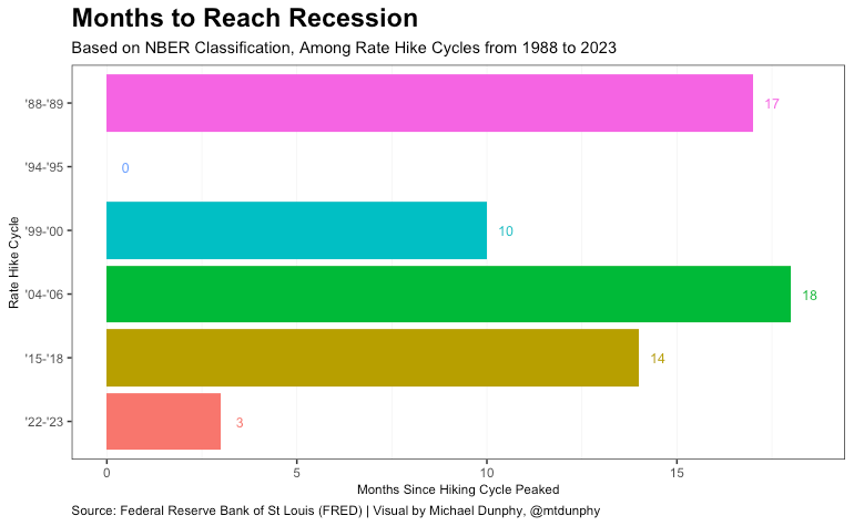 However, is this victory lap premature? Analyzing past rate hike cycles suggest the full effects of the Fed’s actions have yet to reverberate throughout the real economy. In this post, I look at the previous five rate hike cycles and see how it compares to the current Fed’s landing of the economic airplane. The data and code used in this analysis can be viewed here on GitHub.
